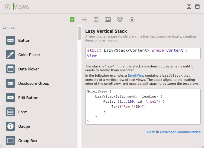VStack 옆에 (를 한 번 입력하면 다음과 같은 속성들이 표시될 거예요.
