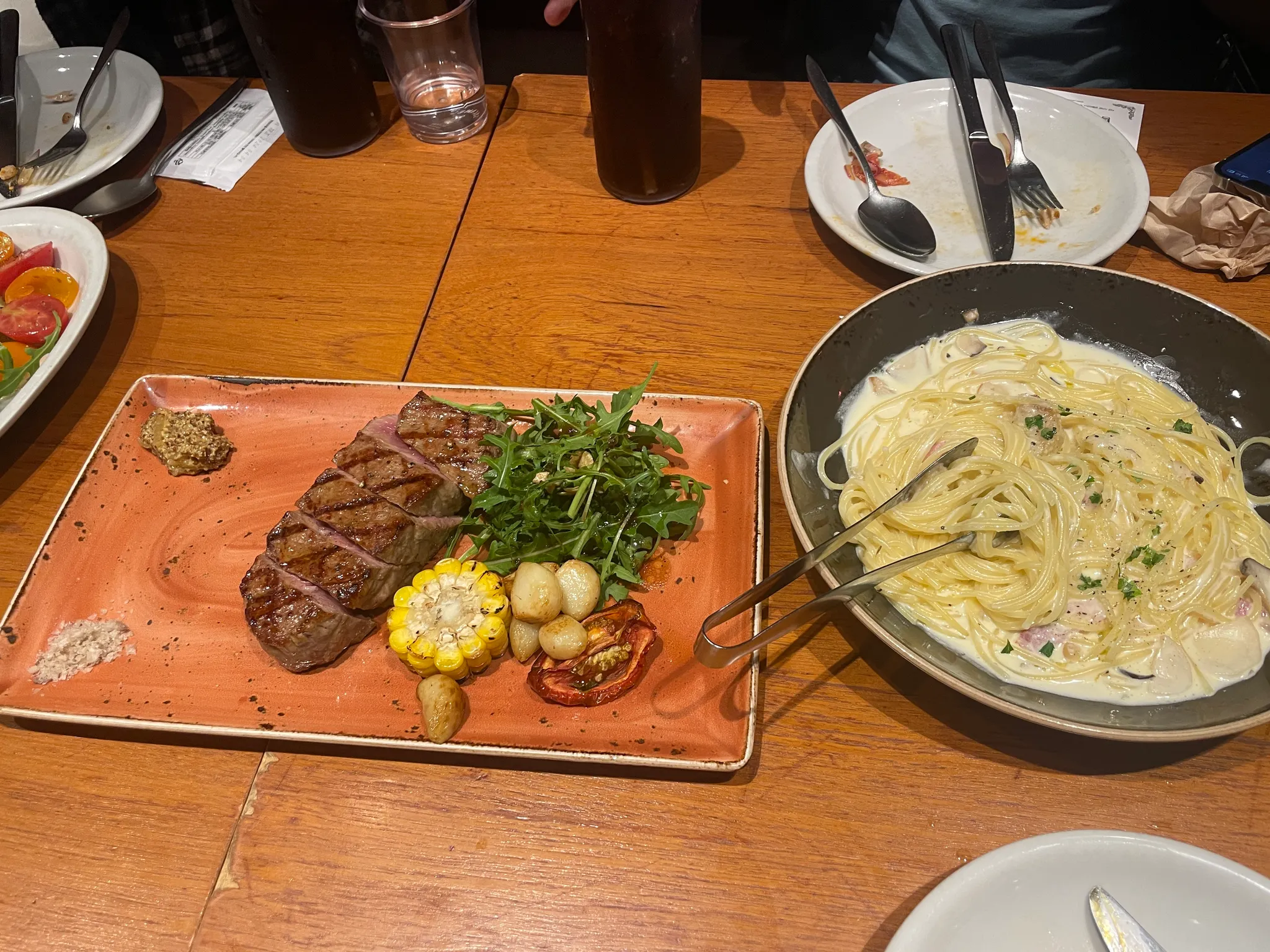 파스타, 피자, 샐러드, 스테이크를 시켰는데 스테이크가 너무 맛있었다. 밥을 먹으며 개발 이야기를 끊임없이 나눴고 내 옆 자리에 앉았던 분도 오셨는데 자신이 한 프로젝트를 소개해주었다. 대학교 셔틀버스가 언제 오는지 알려주는 프로그램을 만들었는데 엄청 잘 만들었고 지금도 정류장 뒤에 운영 중이다! 보면서 한국은 땅은 좁은데 천재들은 많다는 것을 느낄 수 있었다.